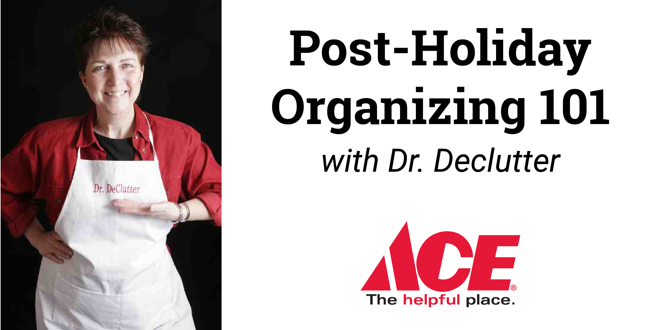 Bring your questions and problem-area-frustrations and get hands-on demonstrations from the aisles of ACE. Kim Wolinski, “Dr. DeClutter” will show you the newest and best products, containers, systems and gadgets that will streamline your organizing needs while offering consistent practical, affordable and doable solutions to your every question